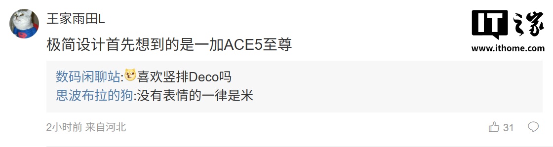 后续有用户在评论区表示:“极简设计首先想到的是一加 ACE5 至尊”富裕配,博主回复道:“喜欢竖排 Deco 吗”;另一名用户则表示:“我要小米 17Air”,博主则回复道:“🈚”。
