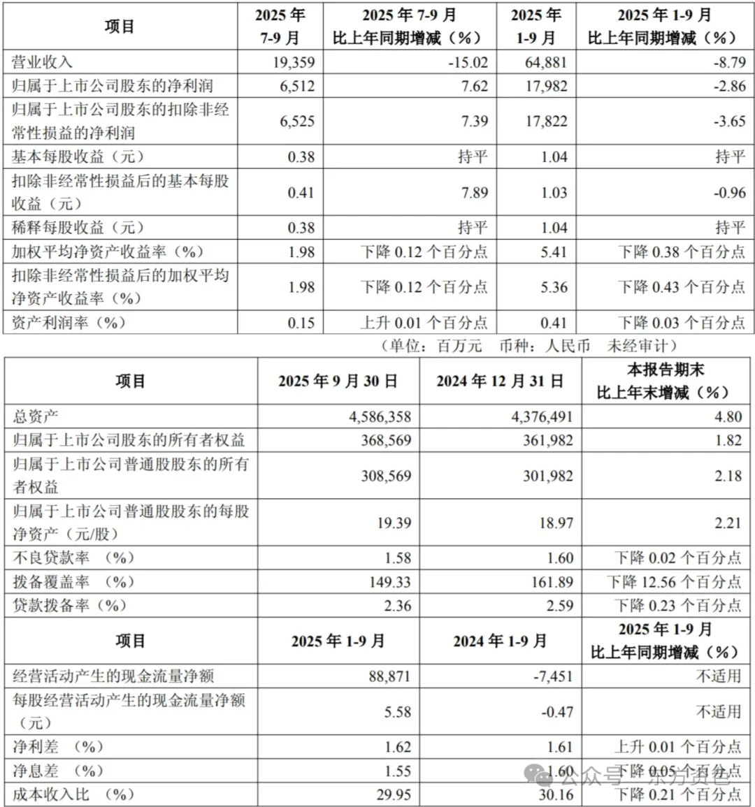 2025年1-9月,报告期末,公司资产总额45863.58亿元,比上年末增加2098.67亿元,增长4.80%;贷款总额24355.94亿元,比上年末增加692.77亿元,增长2.93%。负债总额42137.51亿元,比上年末增加2029.44亿元,增长5.06%;存款总额23389.60亿元,比上年末增加1875.90亿元银河配资,增长8.72%。