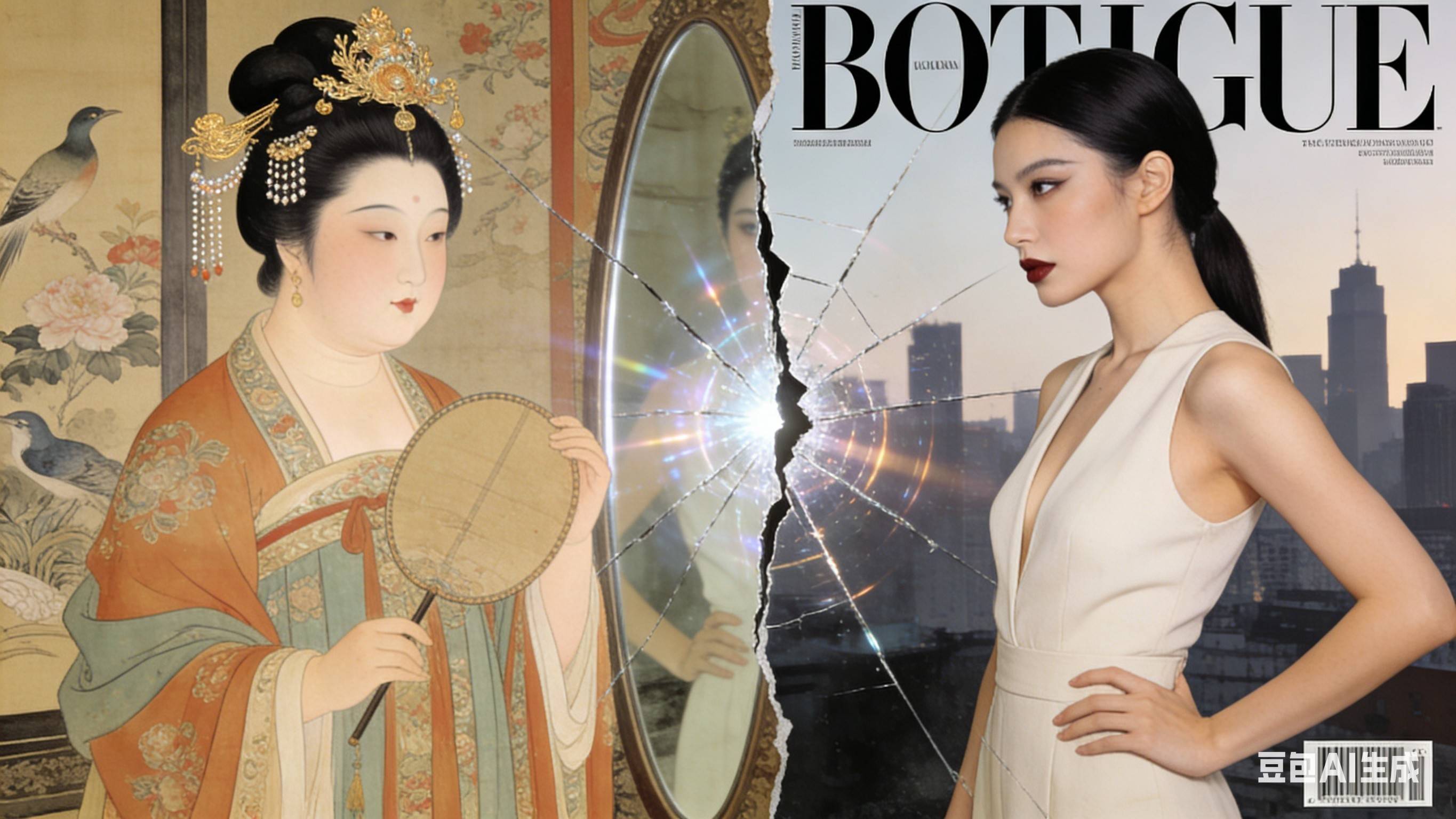 生成一张双联画风格的图像。左侧是唐代周昉《簪花仕女图》风格的古典宫廷美人,右侧是符合当代时尚杂志封面的现代独立女性形象。两者虽隔千年,却通过一面破碎又相连的镜子(或相似的姿态、眼神)产生超越时空的对话与凝视。需配文探讨审美标准的流变与不变。